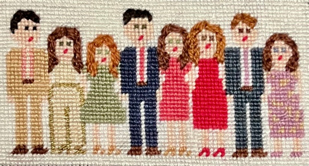 Due to the small size of each person, I am not able to add glasses or other tiny accessories. However, I recommend backstitching these tiny details on a person after needlepointing the target area. Similarly, backstitching or using two different stitch types is a great way to distinguish the arms from the torso of people wearing long-sleeved shirts, coats, and/or sweaters.